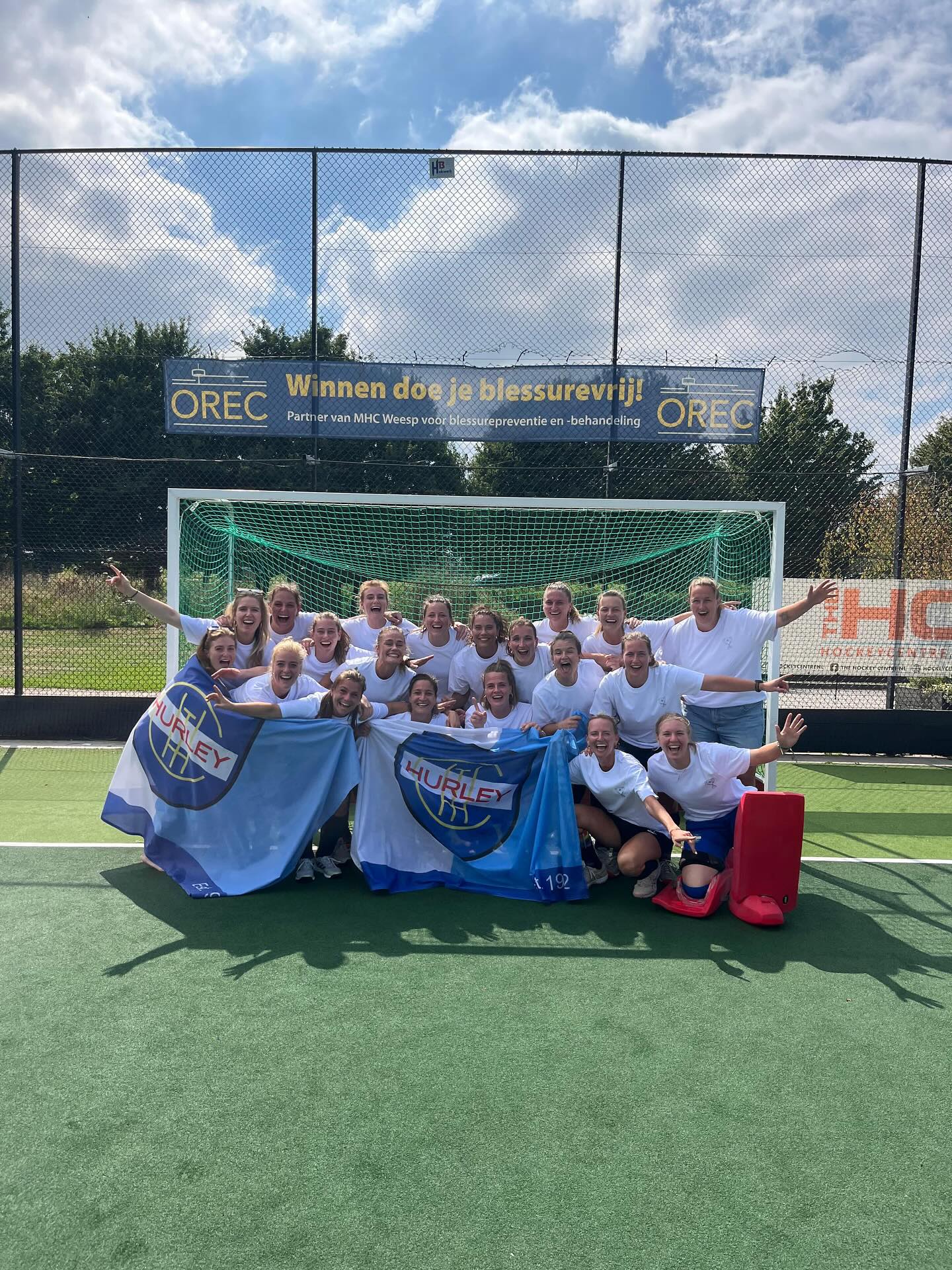 Hurley Dames 1 is na één jaar afwezigheid volgend seizoen terug op het hoogste niveau in de zaalcompetitie. Afgelopen zondag speelden zij 3 wedstrijden tegen 2 andere District-kampioenen (Huizen en Craeyenhout) en tegen de nummer 5 uit de Hoofdklasse (Voordaan). Alleen de laatste wedstrijd van de dag werd verloren, tegen Voordaan, maar op dat moment waren de Dames al gepromoveerd. Gefeliciteerd Dames en coach Rémi Talma!